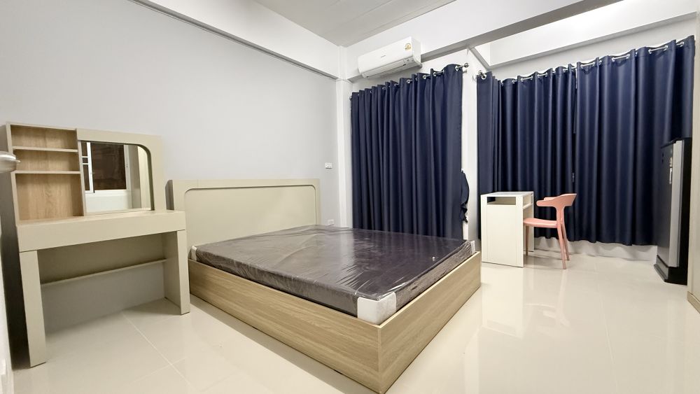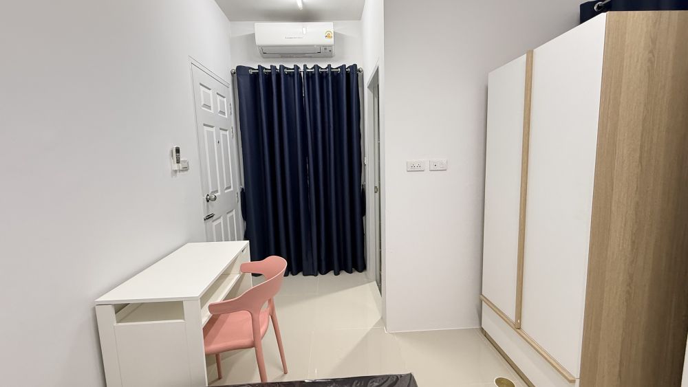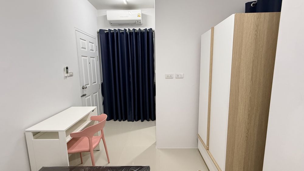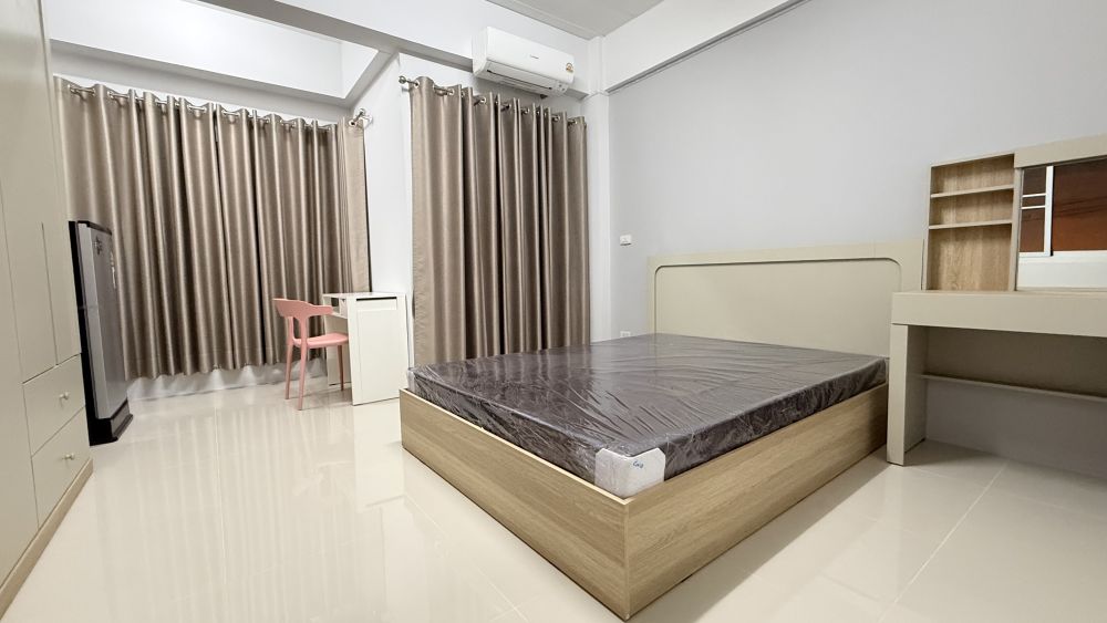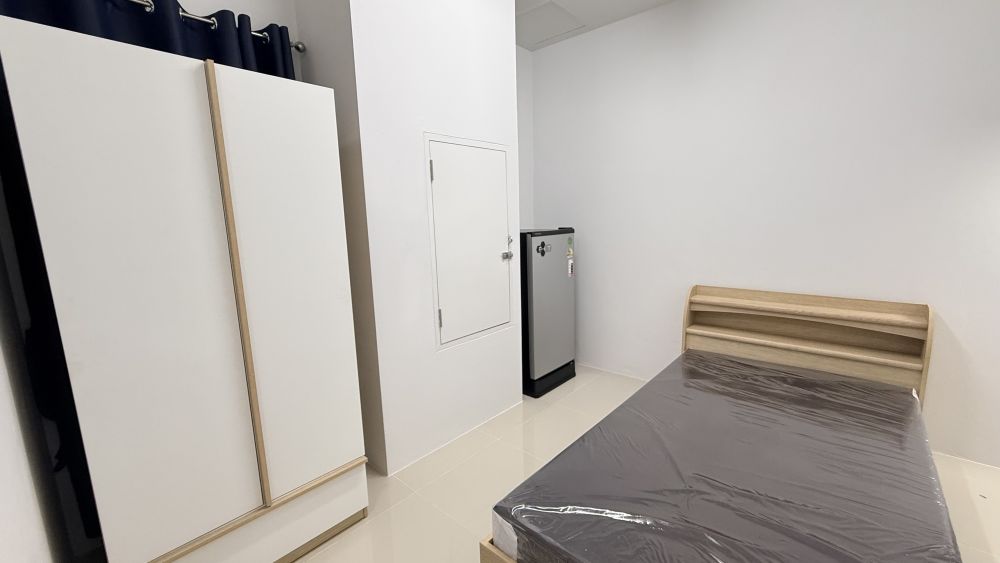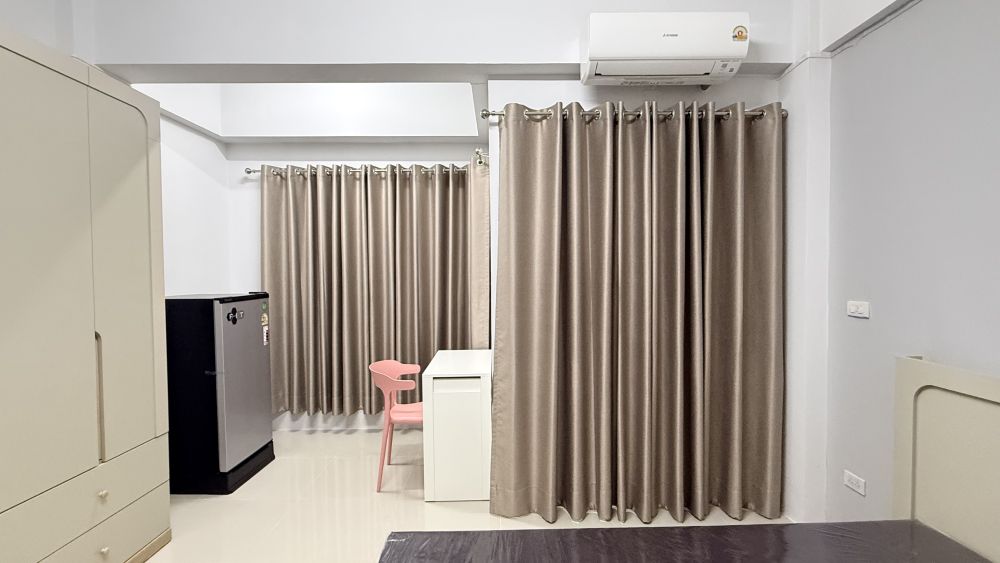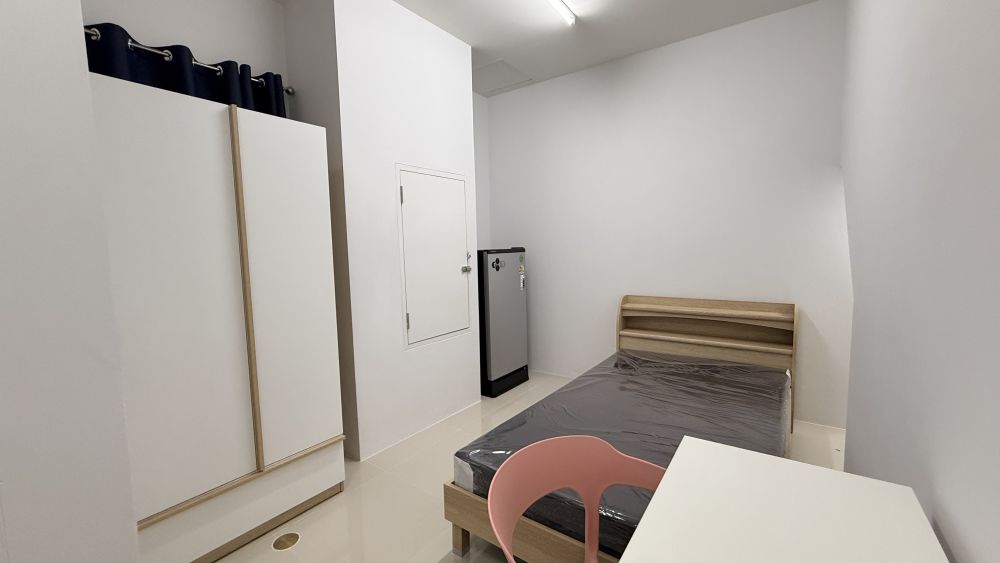 พื้นที่: 4.5 x 3 เมตรห้องเล็กแต่ก็มีเฟอร์นิเจอร์ เครื่องใช้ไฟฟ้า แอร์ ตู้เย็น เครื่องทำน้ำอุ่น ครบเหมือนห้องใหญ่
