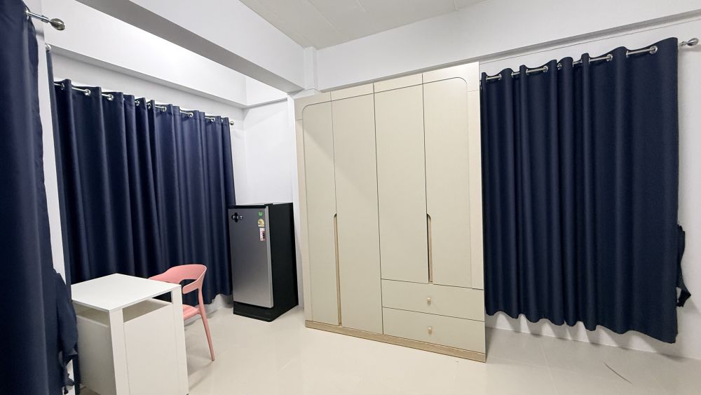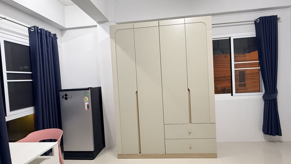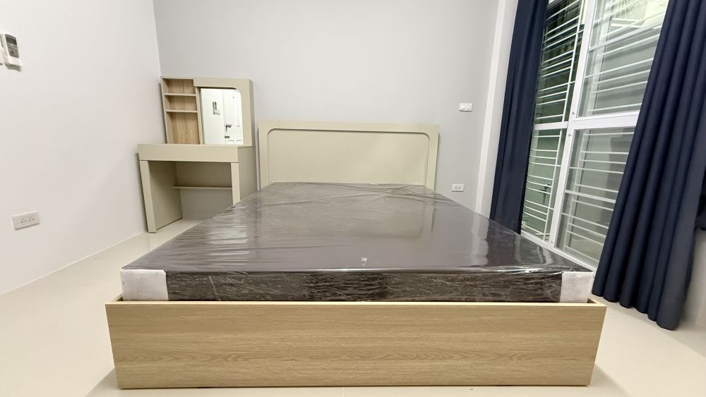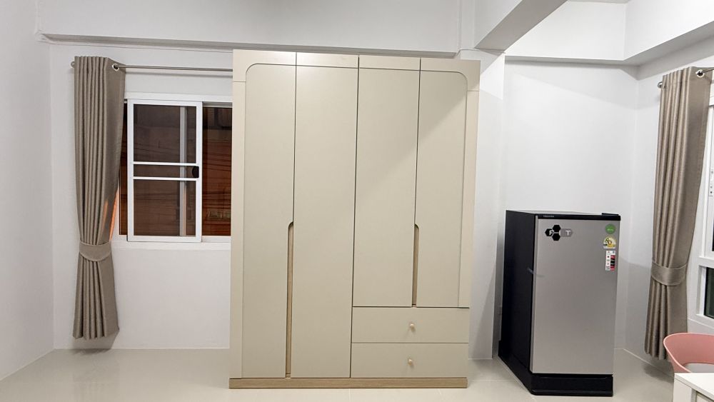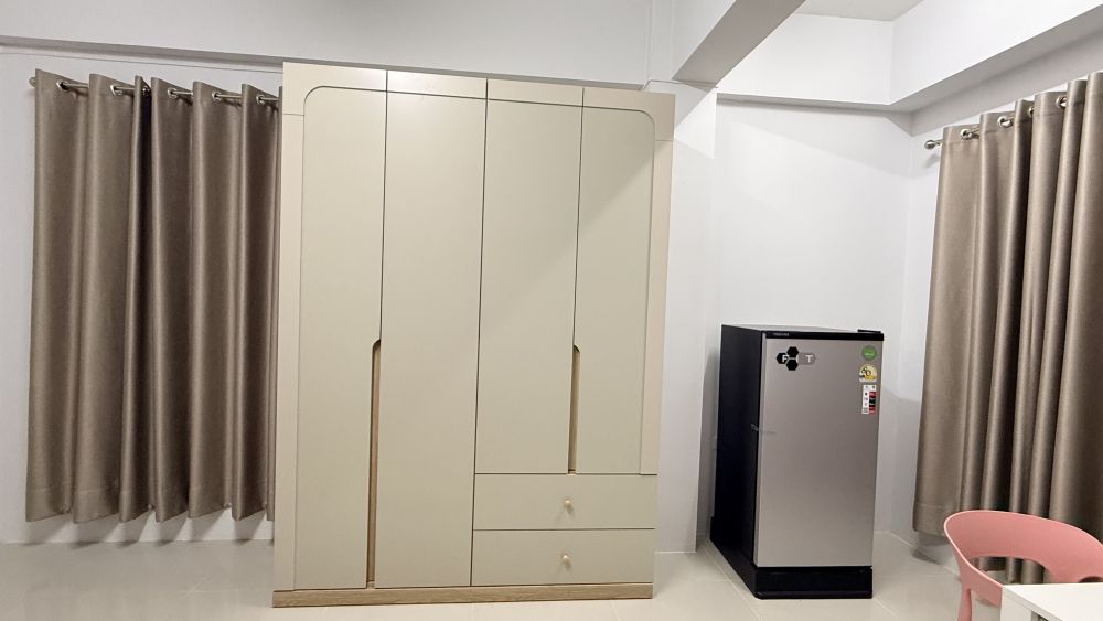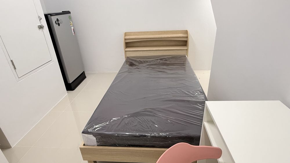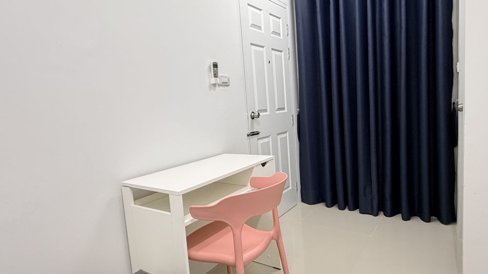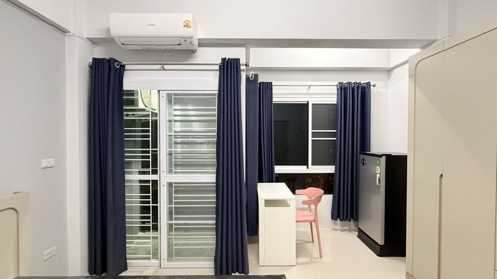 พื้นที่: 4.5 x 3 เมตรห้องเล็กแต่ก็มีเฟอร์นิเจอร์ เครื่องใช้ไฟฟ้า แอร์ ตู้เย็น เครื่องทำน้ำอุ่น ครบเหมือนห้องใหญ่